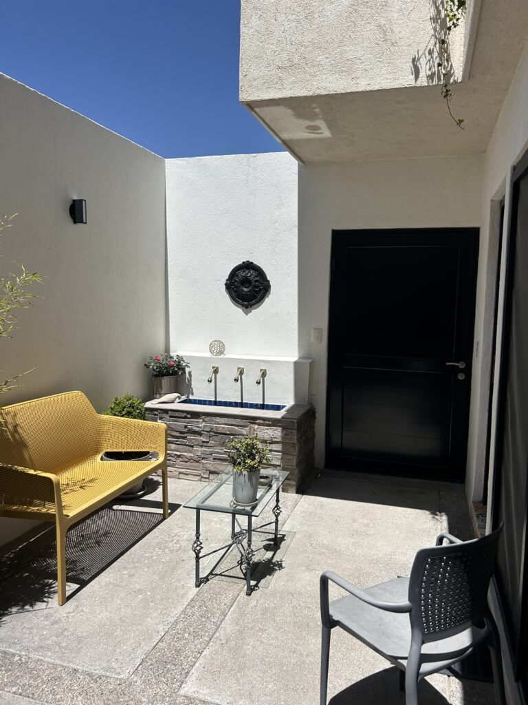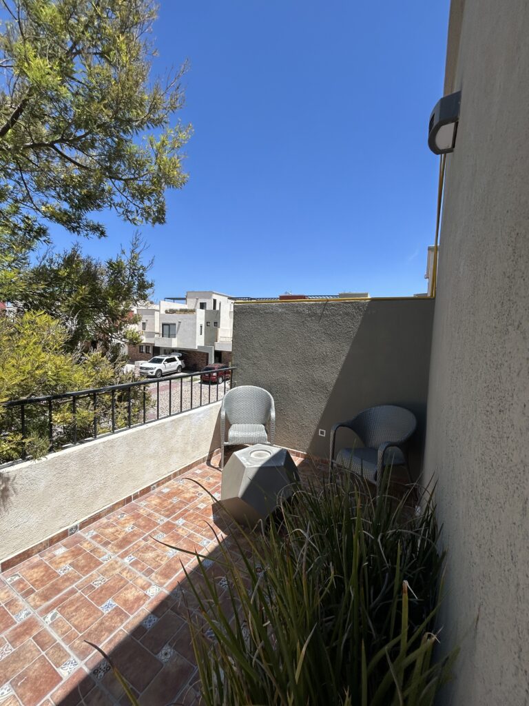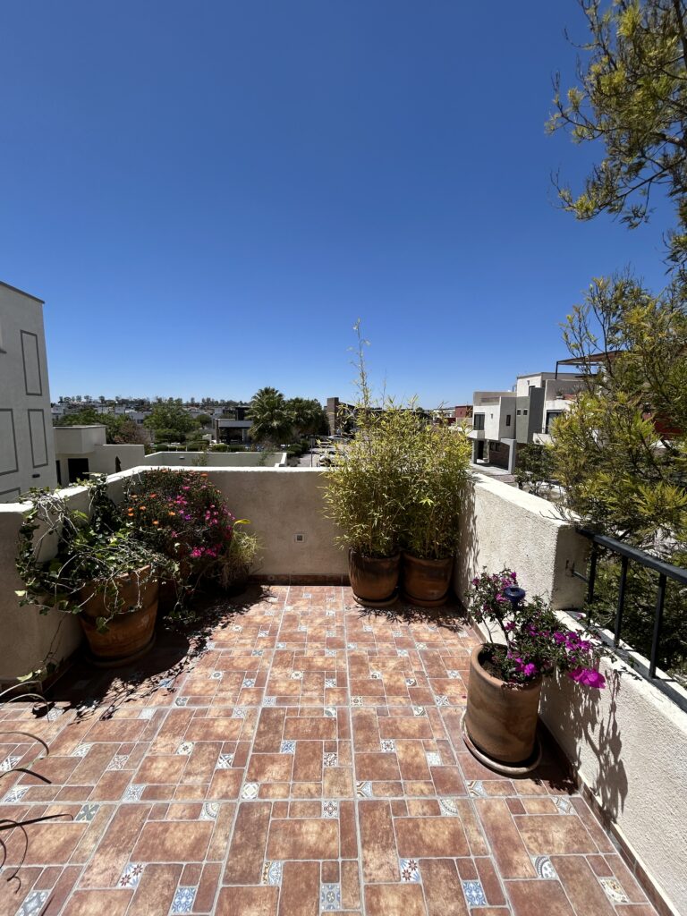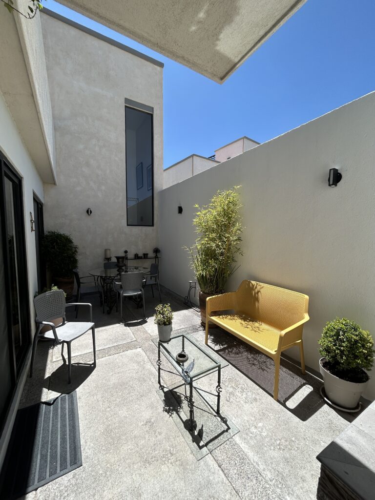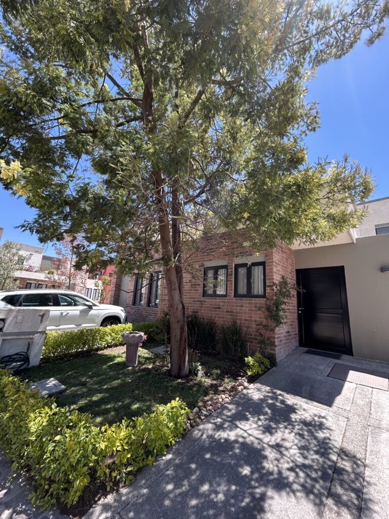 Casa en 2 niveles, 3 recámaras, 3 baños, una recámara en planta baja, 2 lugares de estacionamiento, jardín al frente, patio trasero, patio interior, fuente, bodega, terraza, equipado y amueblado,
